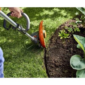 Akkukäyttöinen ruohotrimmeri reunaleikkuritilalla ja muilla lisäosana myytävillä lisävarusteilla.