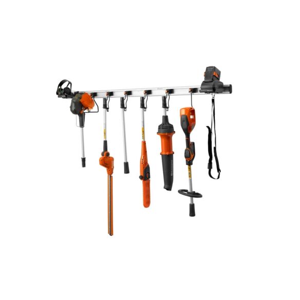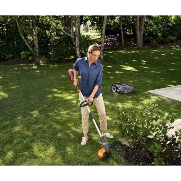 Akkukäyttöinen ruohotrimmeri reunaleikkuritilalla ja muilla lisäosana myytävillä lisävarusteilla.