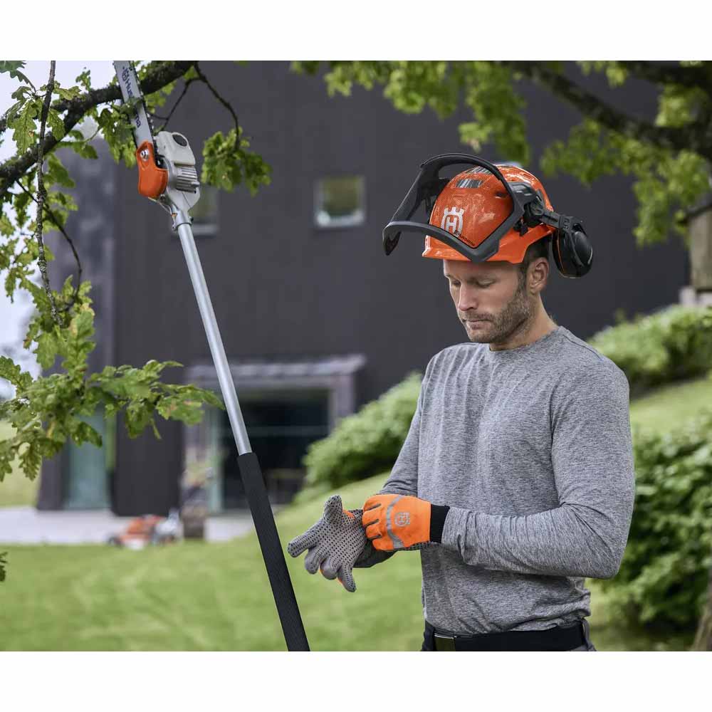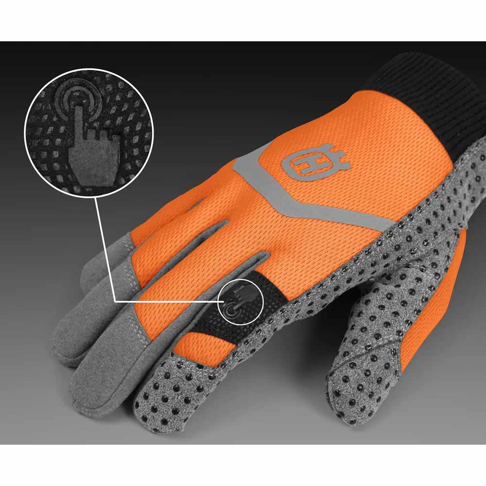 Ohuet ja hyvin hengittävät suojakäsineet, jotka on suunniteltu monipuolisiin puutarha- ja metsätöihin lämpimällä ja kuivalla säällä. Käsineen kämmenosa on valmistettu hengittävästä, nopeasti kuivuvasta synteettisestä nahasta, joka tarjoaa hyvän pidon samalla, kun kämmentäsi suojaa iskuja vaimentava pehmuste. Etusormessa on kosketusnäyttöystävällinen rystynen, joten voit käyttää älypuhelinta myös hanskat kädessä. Käsineet on helppo pestä käsin ja pinttynyt lika, kuten hartsi, irtoaa käsineistä myös helposti. Täyttää standardin EN 388:2016.