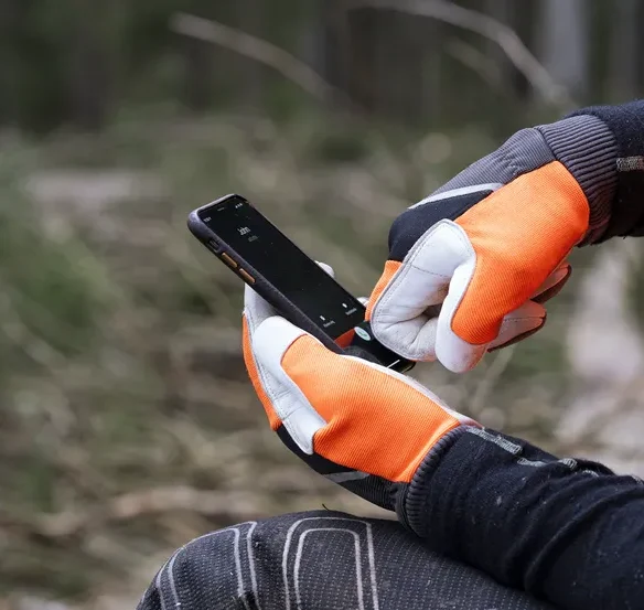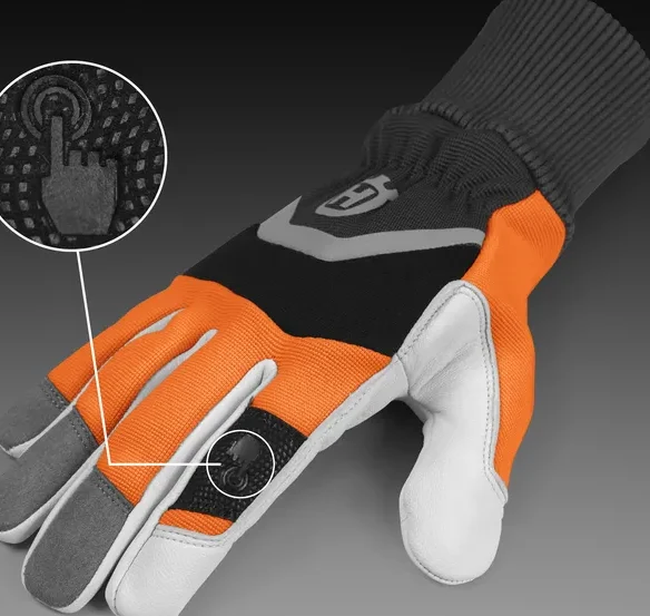Miellyttävien viiltosuojakäsineiden kaksinkertainen kämmenosa on vuohennahkaa, kämmensel spandex-kangasta ja rystyset nailonneopreenia. Vuohennahka sisältää kosteudelta suojaavaa luonnollista rasvaa ja sopii siksi vaativiin töihin. Neulottu kalvosin on käytössä mukava ja helpottaa käsineen pukemista. Viiltosuoja vasemman käsineen kämmenselässä.