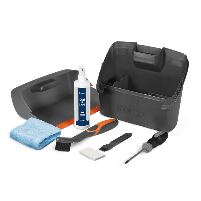 Tarvikkeet Automower-leikkurin puhdistamiseen ja hoitamiseen kauden aikana. Sisältää kaksi harjaa; toinen kapea ja terävä ja toinen pieni, raaputtimella varustettu harja lian ja kuivuneen ruohon poistamiseen. Ruuvimeisseli leikkuuterien vaihtamista varten, hankausliina leikkurin ja latausaseman liittimien puhdistamiseen sekä pyyhe ja muoville tarkoitettu hoitosuihke, joilla muoviosat saa kiiltäviksi.