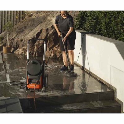 Koneen siirtäminen sujuu helposti alumiinisen kantokahvan avulla. Letkun pikaliitäntä, suuret, tukevat ja pitävät pyörät sekä pitkä ruiskuvarsi lisäävät käyttömukavuutta. Käyttöä tehostavat lisävarusteiden ja virtajohdon säilytystilat sekä letkukela. Mukana toimitetaan kaksi suutinta ja yksi vaahtoruisku.