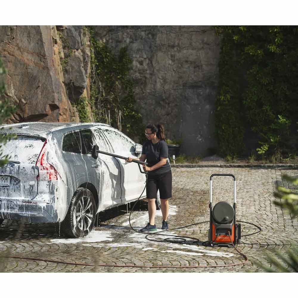 PW 370 on yhteensopiva useiden lisävarusteiden kanssa, ja kun työ on valmis, rullaus tapahtuu nopeasti tukiohjaimella varustetun letkukelan avulla, joka tarjoaa myös kätevän varastoinnin letkulle. Pesurissa on suuret, pehmustetut pyörät, jotka takaavat erinomaisen pidon myös vaativassa maastossa sekä kokoontaittuva alumiinikahva, jonka avulla pesuria voi säilyttää myös pienemmässä tilassa.