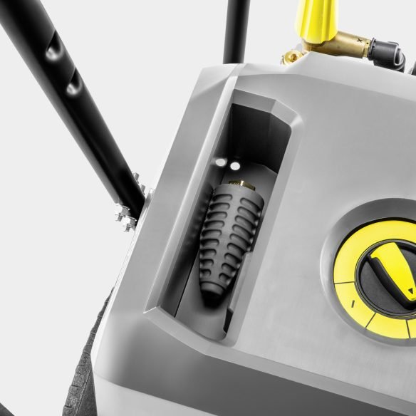 Erittäin kookas ja tehokas painepesuri on muotoilultaan tukeva ja tarkoituksenmukainen. Se on suunniteltu kaikkein vaativimpaan ulkotilojen puhdistukseen. Paineensäätöominaisuudella voit säätää veden virtausta ja painetta kuhunkin tilanteeseen sopivaksi. Sisäänrakennettua pesuainesäiliötä ohjataan etupaneelista. Messinkinen pumpun pää takaa erinomaisen suorituskyvyn pitkäkestoisessakin käytössä. Mukana toimitetaan teräsvahvisteinen paineletku. Helposti painettava liipaisin laukeaa vähemmällä vaivalla, mikä säästää kättäsi rasitukselta. Induktiomoottori takaa luotettavan suorituskyvyn ja alumiininen kantokahva helpottaa koneen siirtämistä. Letkun pikaliitäntä, suuret, tukevat ja pitävät pyörät sekä pitkä ruiskuvarsi lisäävät käyttömukavuutta. Pesurissa on kaksi näppärää niveltoimintoa, toinen suuttimen säädölle ja toinen pikaliitokselle. Sisäänrakennetut lisävarusteiden säilytystila, letkukela ja virtajohdon säilytystila tekevät pesurin käytöstä tehokasta. Mukana on kaksi suutinta.