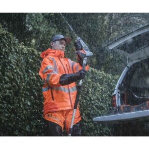 Laadukas sadetakki, jossa on lisävahvikkeet helposti kuluvissa kohdissa. Takin tekninen pinnoite ja teipatut saumat varmistavat, että se on vettä hylkivä, mutta samalla hengittävä. Valmistettu kestävästä polyesteristä, jossa on mekaaninen jousto. Takissa on irrotettava huppu, ja siinä on hyvän istuvuuden takaava säädettävä vyötärö ja helma. Taskuissa on vesitiiviit vetoketjut, jotka pitävät sisällön suojattuna ja kuivana. Hyväksytty standardin EN ISO 20471 luokan 3 ja standardin EN343 mukaisesti.