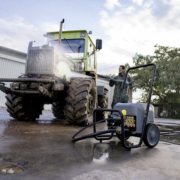 Tämä supersarjan kylmävesipesuripesuri on suunniteltu kohteisiin, joissa helppokäyttöistä ja varmatoimista peruspesuria, jossa on suuri vedentuottokyky. Vankan teräskehikon sisään rakennettu pesuri kulkee kookkaiden pyörien ansiosta kevyesti kohteesta toiseen. Kärcherin patentoitu suutinteknologia tuottaa koko leveydeltään tasaisen voimakkaan korkeapainesuihkun, jonka ansiosta saavutetaan ensiluokkainen puhdistustulos nopeasti ja veden kulutus optimoiden. Pitkän käyttöiän takaa hidaskierroksinen, 4-napainen sähkömoottori sekä kampiakselipumppu, jossa on keraamiset männät ja messinkipääty. Myös pesurin liitännät ovat kestävää, korkealaatuista messinkiä. EASY!Lock pikakiinnitysjärjestelmä mahdollistaa viisi kertaa nopeamman käsittelyn, kuin perinteisissä ruuviliitoksissa. Käyttäjä voi säätää painetta ja vesimäärää pumpussa olevan säätimen avulla.