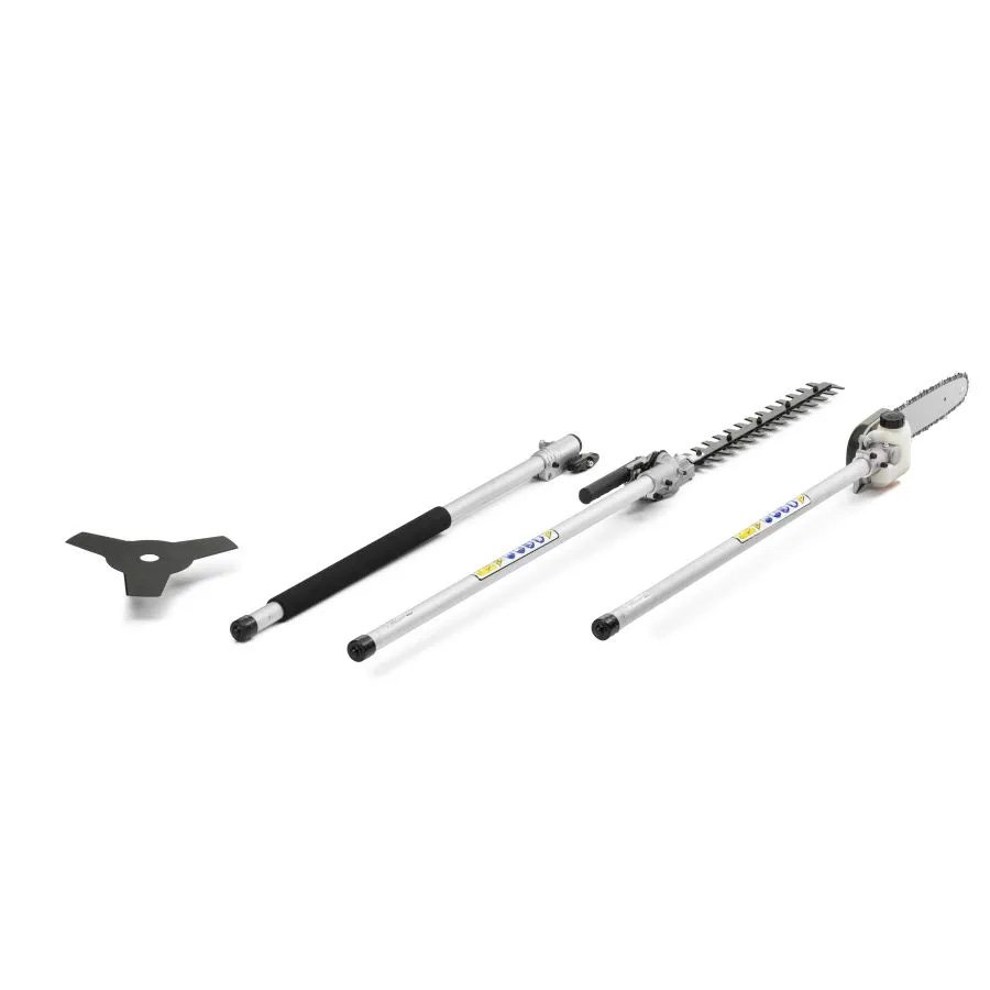 25,4 cc polttomoottorilla varustettu monitoimityökalu, jossa viisi eri osaa: trimmeri siimapäällä ja metalliterällä, pensasleikkuri ja oksaleikkuri sekä jatkovarsi.